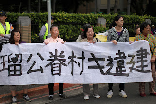 另外,新店瑠公圳眷村的居民也來到行政院前,表達反對拆遷的訴求。居民劉小姐表示,目前瑠公圳眷村是民國49年時因為公家眷村不足,因此允諾居民於軍營周圍土地興建住宅的「非列管眷村」。2009年,台北縣政府以「美化城市」、興建公園為理由,提出拆遷時程表。其中讓居民無法諒解的是,當初「蔣經國認可」的眷村沒有清楚土地產權登記,如今卻被視為「違章建築」而面臨拆除。目前眷村約100戶,依照政府的時程表,第一期將在明年2月拆遷其中的51戶。劉小姐指出,2009年協調會時,副縣長李四川明確承諾「先安置、再拆遷」,至今卻仍未召開說明會,讓居民無法接受。