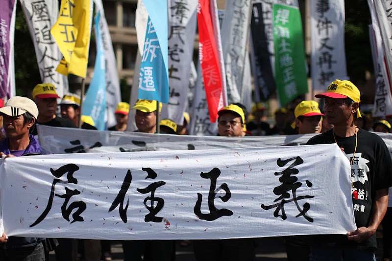 因捷運環狀工程而面臨拆遷的十四張聚落居民、30年共被拆遷7次的三鶯部落,以及反迫遷行動小組,今(27)日於行政院前歃血結盟;他們將自己的血,壓印在「還我土地」的旗幟上,表達反對土地炒作、要求居住權的訴求與決心。